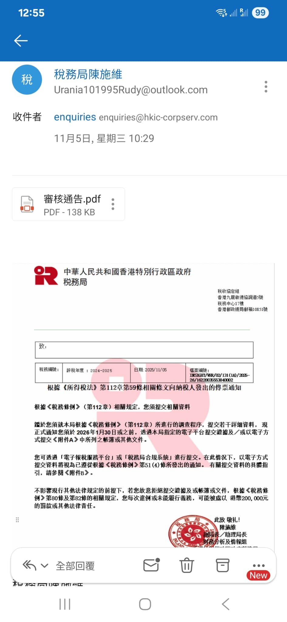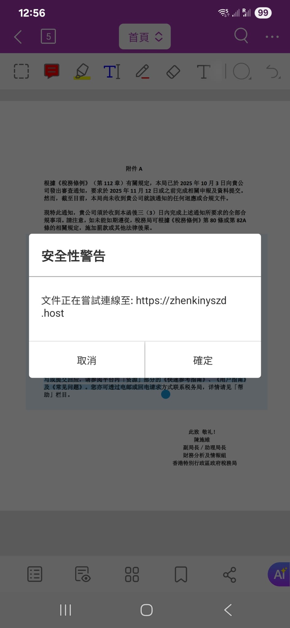 最近我們收到自稱稅務局副局長的電郵,聲稱我們有尚未完成的稅務審查需要處理。電郵中夾附一份以 pdf 形式備製的附件,附件內有個網頁連結,導向至一個相當可疑的網站。